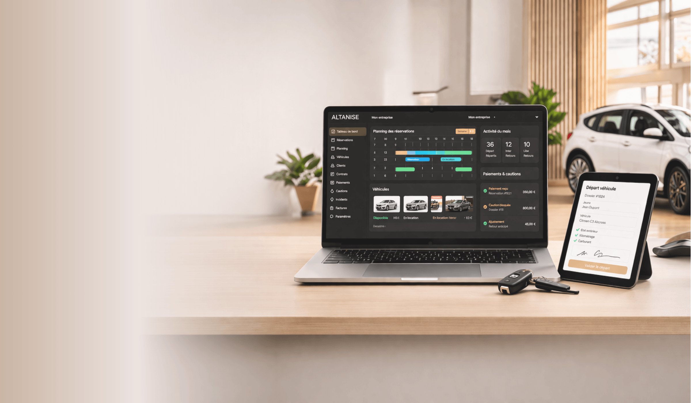 Altanise vous aide à structurer votre activité sans surcharge inutile : réservations, contrats, paiements, terrain et suivi plus propre de votre flotte.