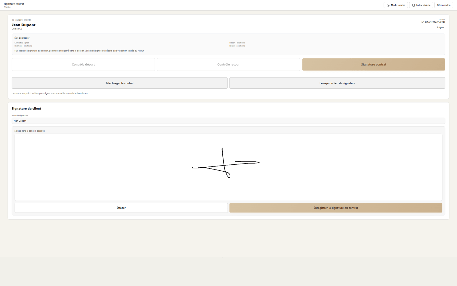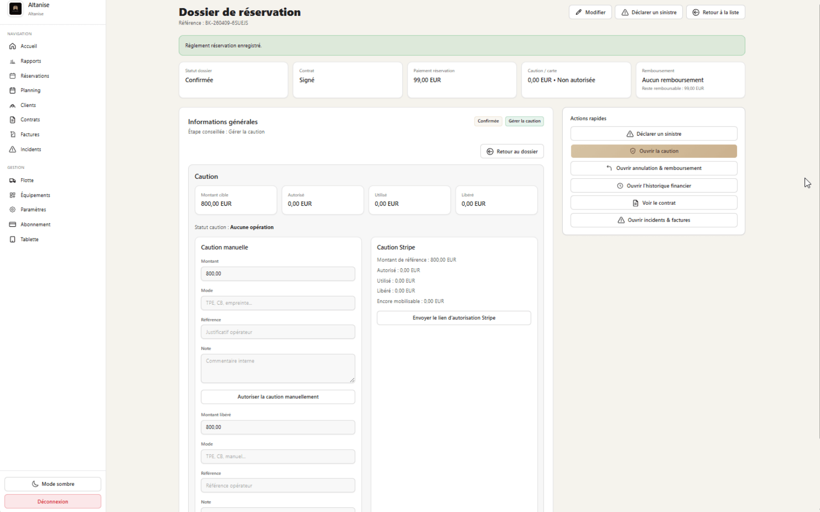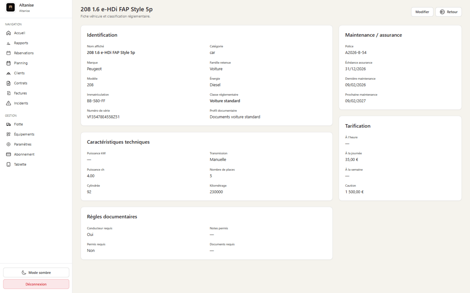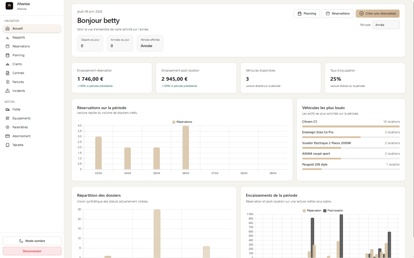 Altanise vous permet de centraliser l’ensemble de votre activité locative dans un seul espace. Vous suivez plus facilement vos réservations, vos véhicules disponibles, vos contrats signés, les paiements reçus, les cautions, les départs et les retours en cours.