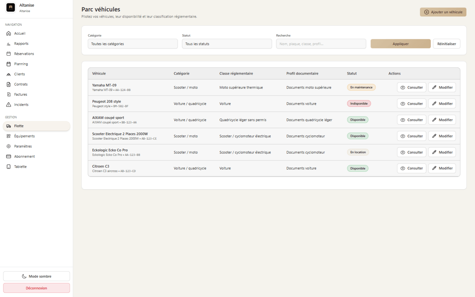 Que vous proposiez de la location de voitures, de scooters thermiques ou électriques, de motos, ou encore de vélos, Altanise vous aide à organiser votre flotte de manière claire et professionnelle.