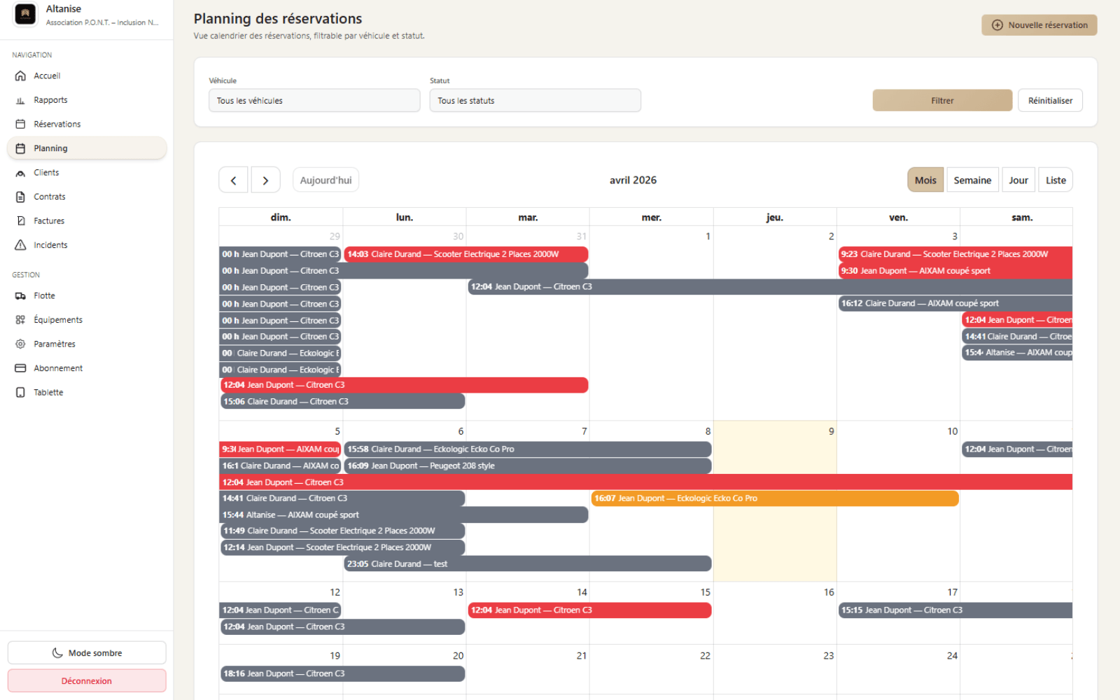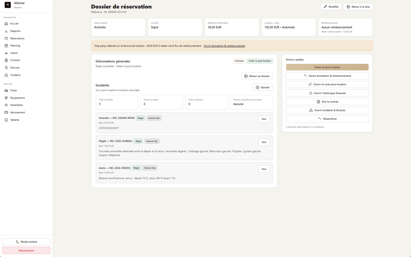 Altanise est une solution de gestion locative en ligne conçue pour les professionnels qui veulent gagner du temps, mieux s’organiser et centraliser leur activité dans un seul outil. Réservations, planning, contrats, clients, flotte, paiements, cautions, départs, retours, incidents et facturation : tout est réuni dans une interface unique, pensée pour les usages concrets du terrain.